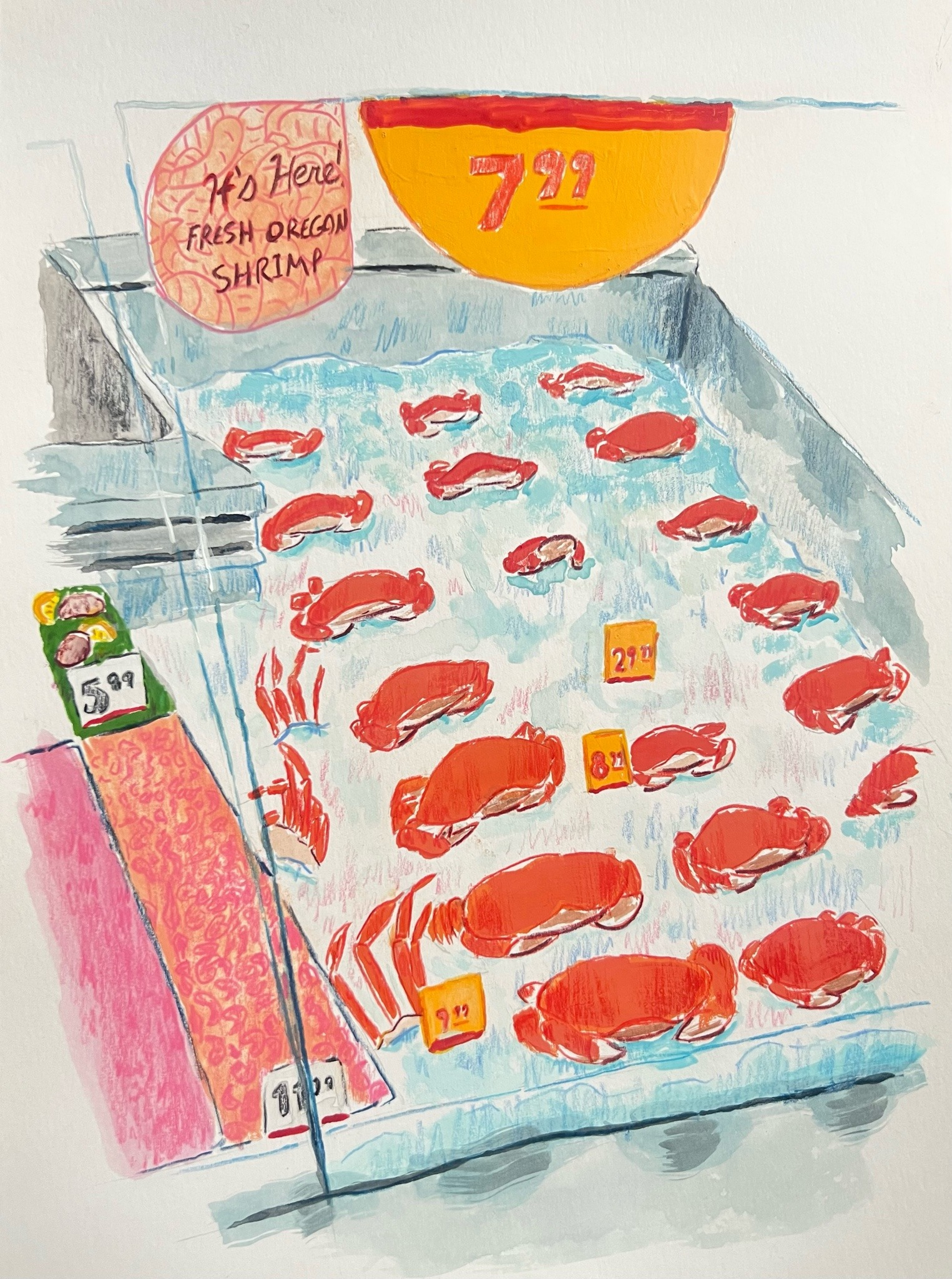 This month's burger is an illustration done by yours truely. I can't say there's much of a story behind it. I was walking through the seafood section of my local food market and saw some crabs. They were lined up so orderly and I thought it would be a great exercise in repetition.